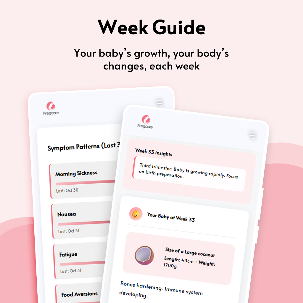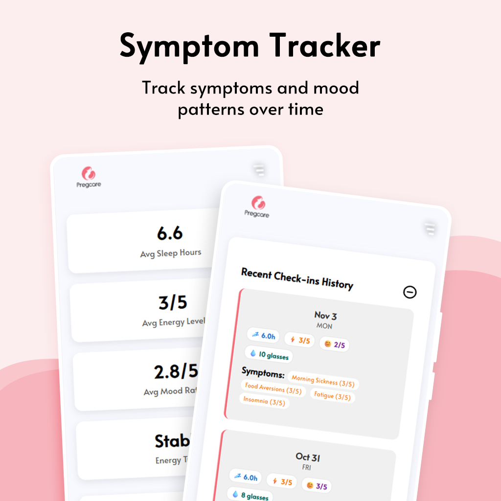 Pregcare offers a suite of intelligent tools created to make every stage of pregnancy easier to understand and manage. From personalized insights and nutrition guidance to health check-ins and symptom tracking, each feature is designed to give you clarity and confidence in your daily care.